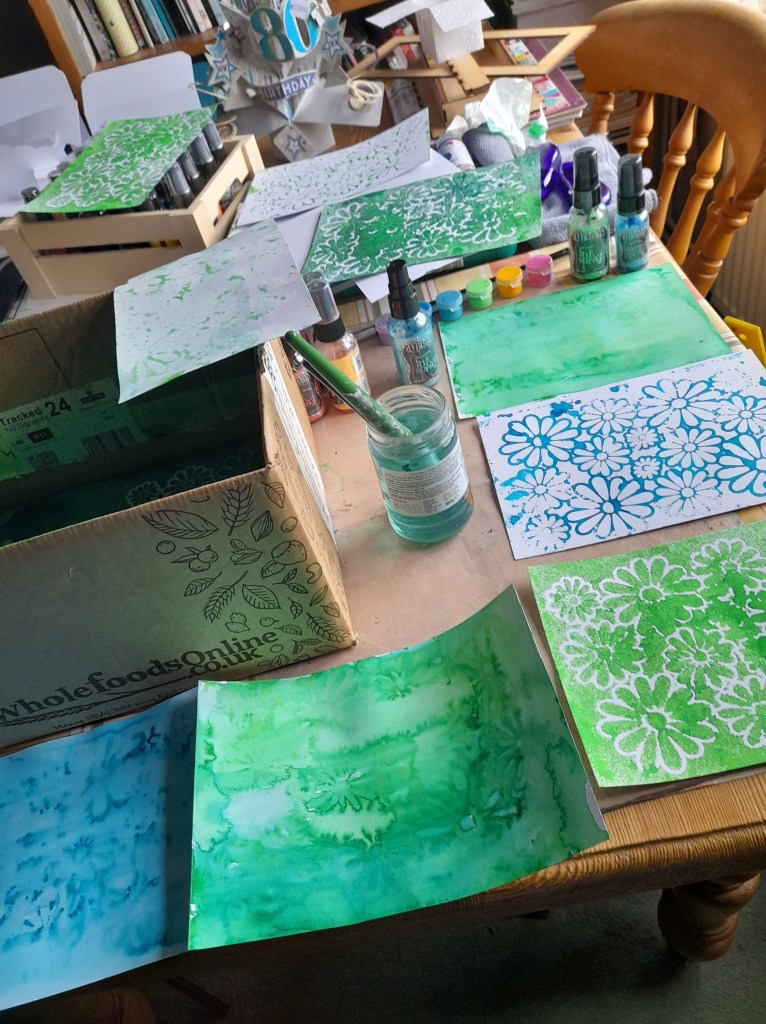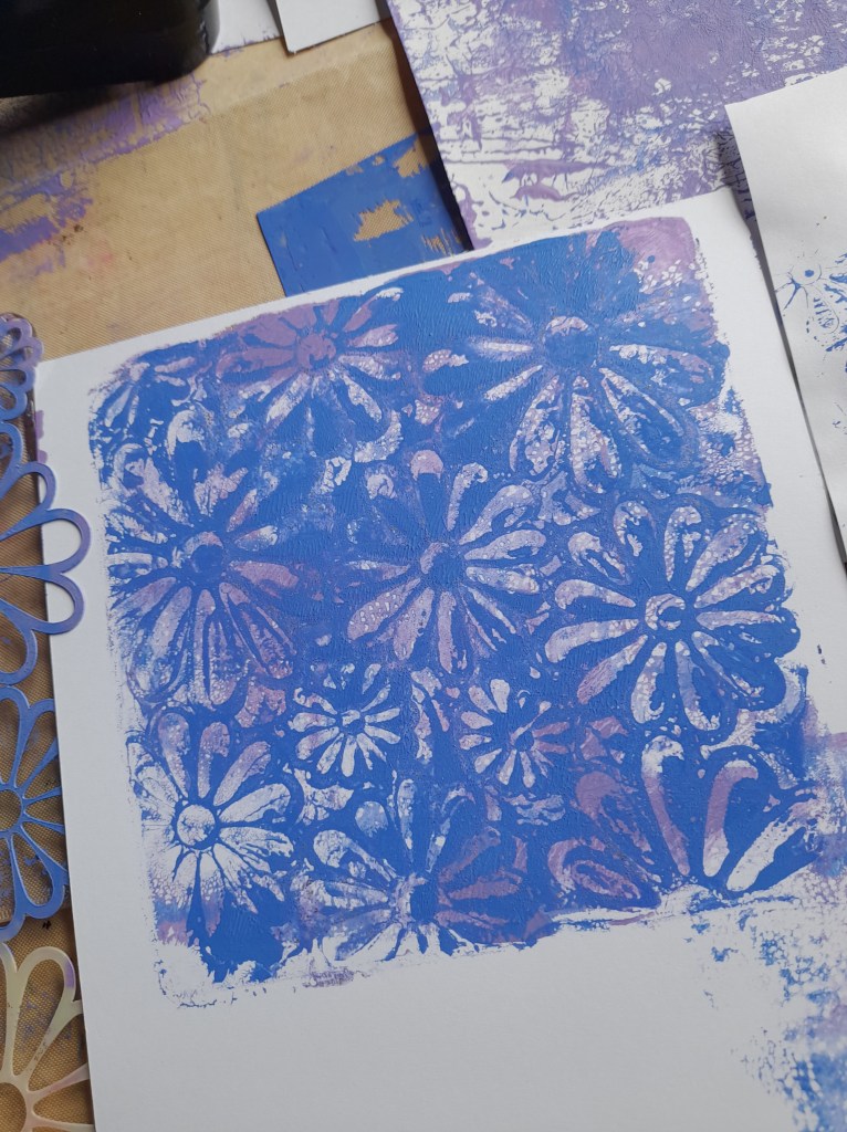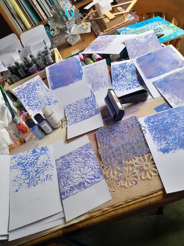 Wow this is fun….one Gelli plate, one brayer, 3 acrylic paints, the lovely IndigoBlu stencil and white card…….so relaxing…..