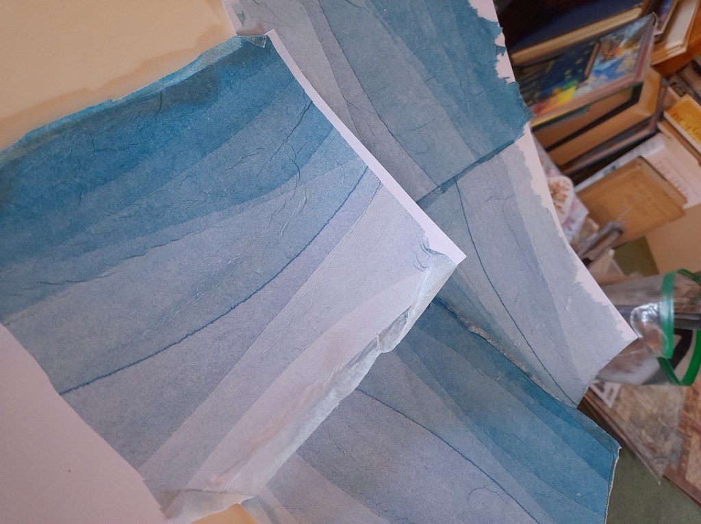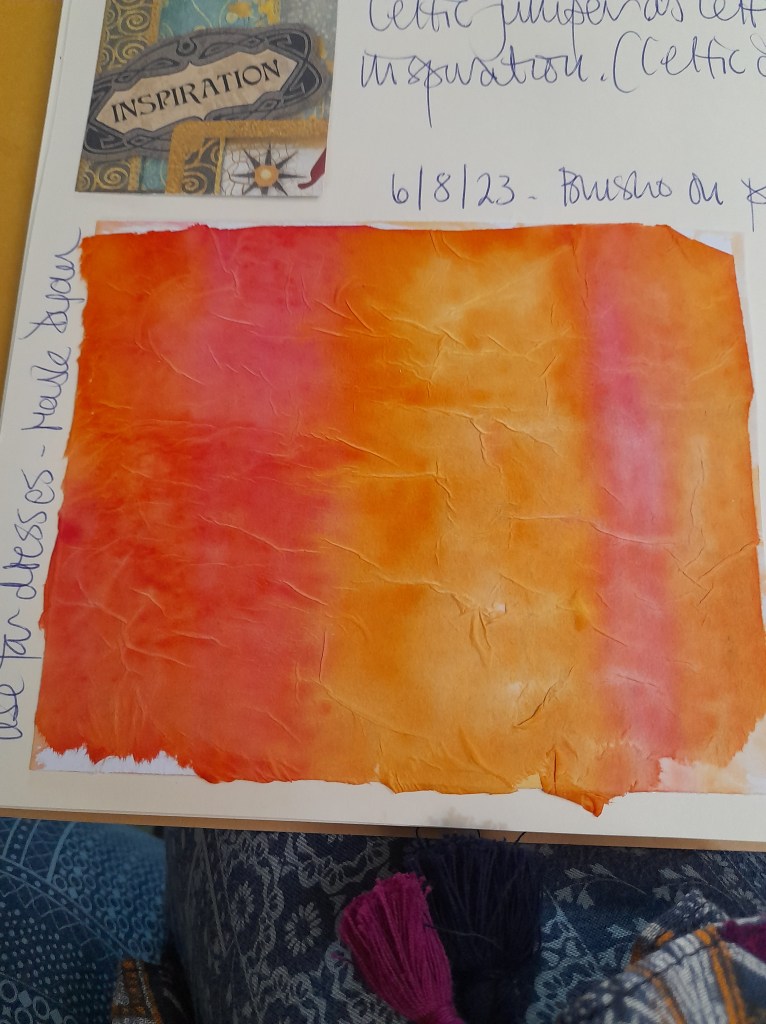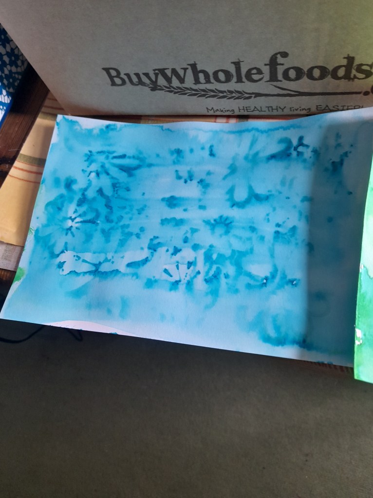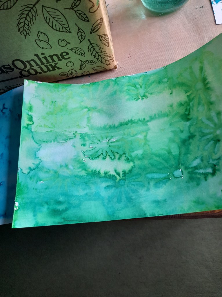 I have been using just the top layer of each napkin for images and that leaves 2 plain ones so I experimented with Brusho inks and here is the first result….love the texture of napkins, like rice paper but a bit more crumpled….feels textured. Using the proper napkin glue by Pinflair….it is really excellent for the process.