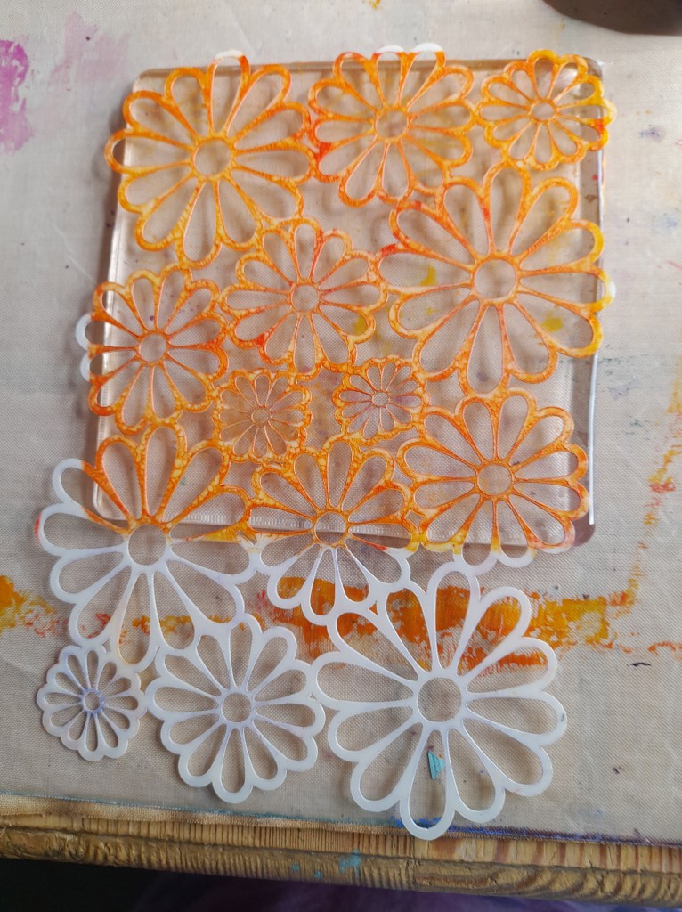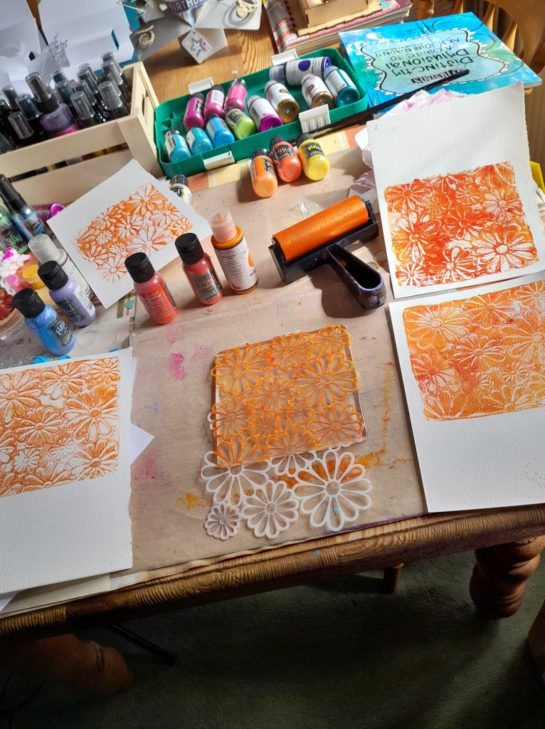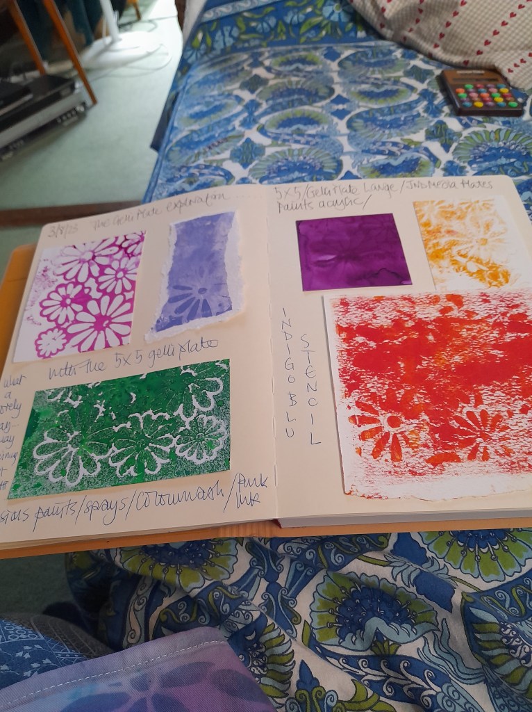 Here is the journal for 3rd August 2023…..stencil, sprays and paints and stencil, paints and the Gelli plate Xx