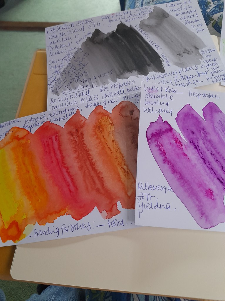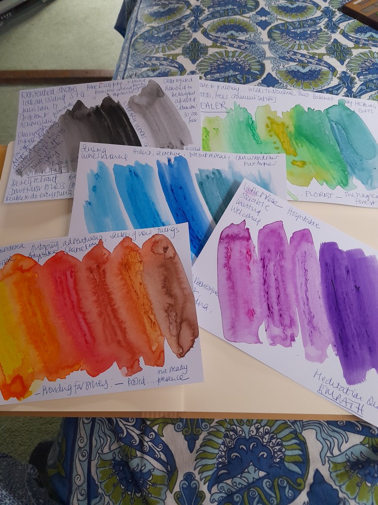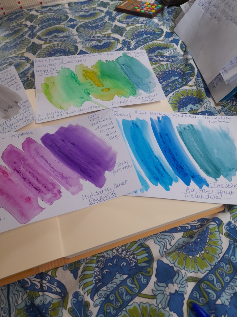 I have begun creating story boards for my characters…my first process is to write a cloud plan…adding features…characteristics, strengths, gifts and flaws, this gave me the feeling of colour for each character. I found this a really helpful process as the colours reveal likes, dislikes, affinities and interests and link the character to a setting in the story and other characters. There are five….at the moment….main characters in story one and the photos show the colours for each one with my notes. I have found this a very creative way of building the characters.