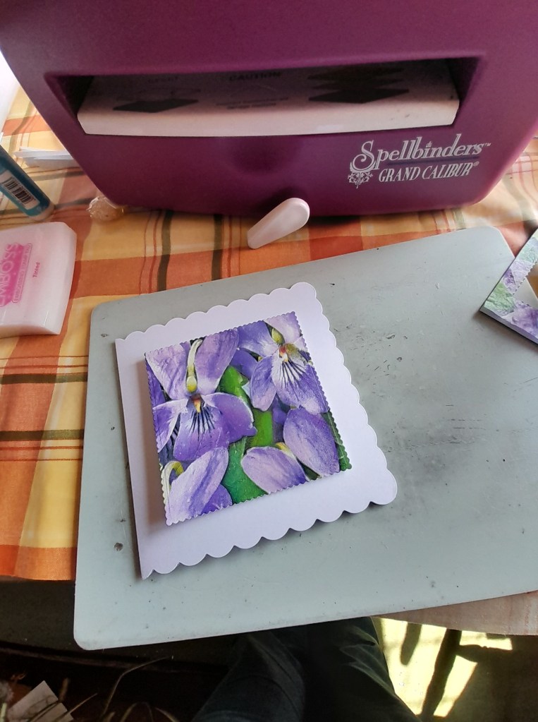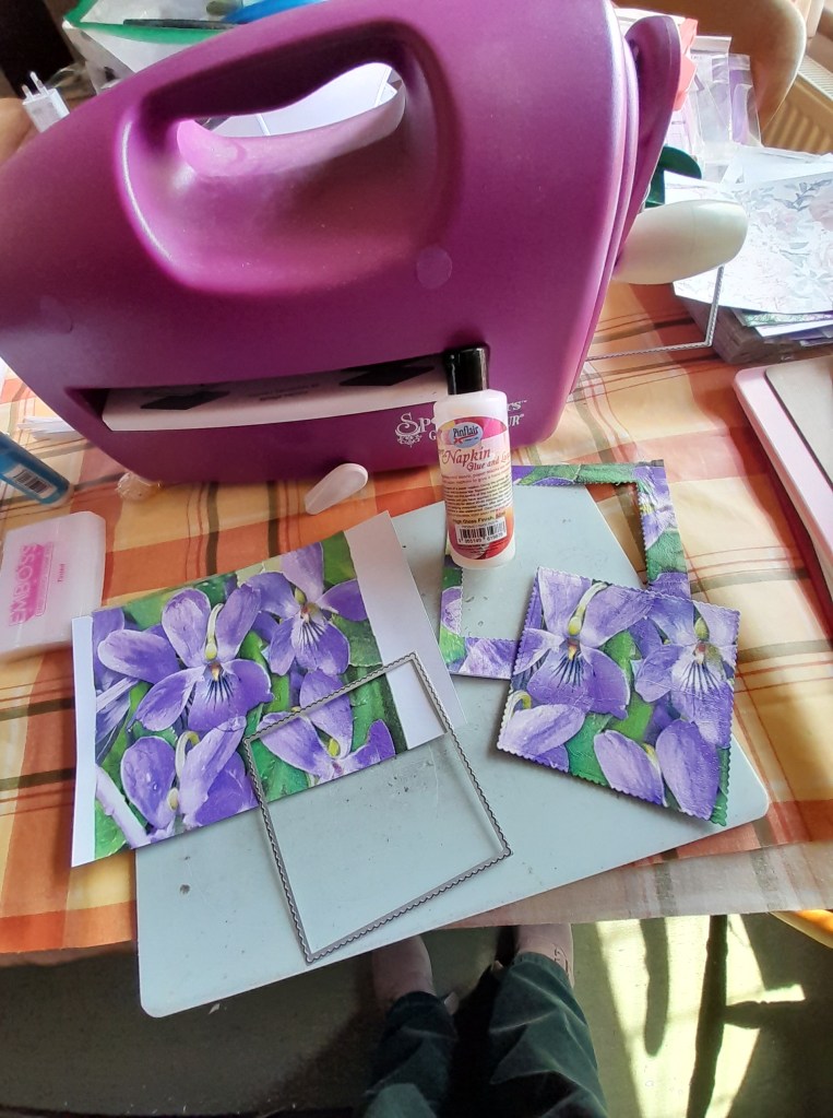 I have always wanted to try making cards with napkins, as there are some beautiful napkins available…. I found this one tucked away in a kitchen drawer…..ordered some specialist napkin glue, watched a tutorial video from Upcycle With Decoupage….you can follow them on Facebook. So found a flat brush and a piece of card and painted the single ply piece of napkin onto the white card. I left it to dry for an hour and then used a Tonic die in my lovely old Grand Caliber machine. …..and created the topper for a scallop white 6 inches by 6 inches card. Am pretty delighted with my first attempt…..have a go, it was a relaxing project. Love Holly xx